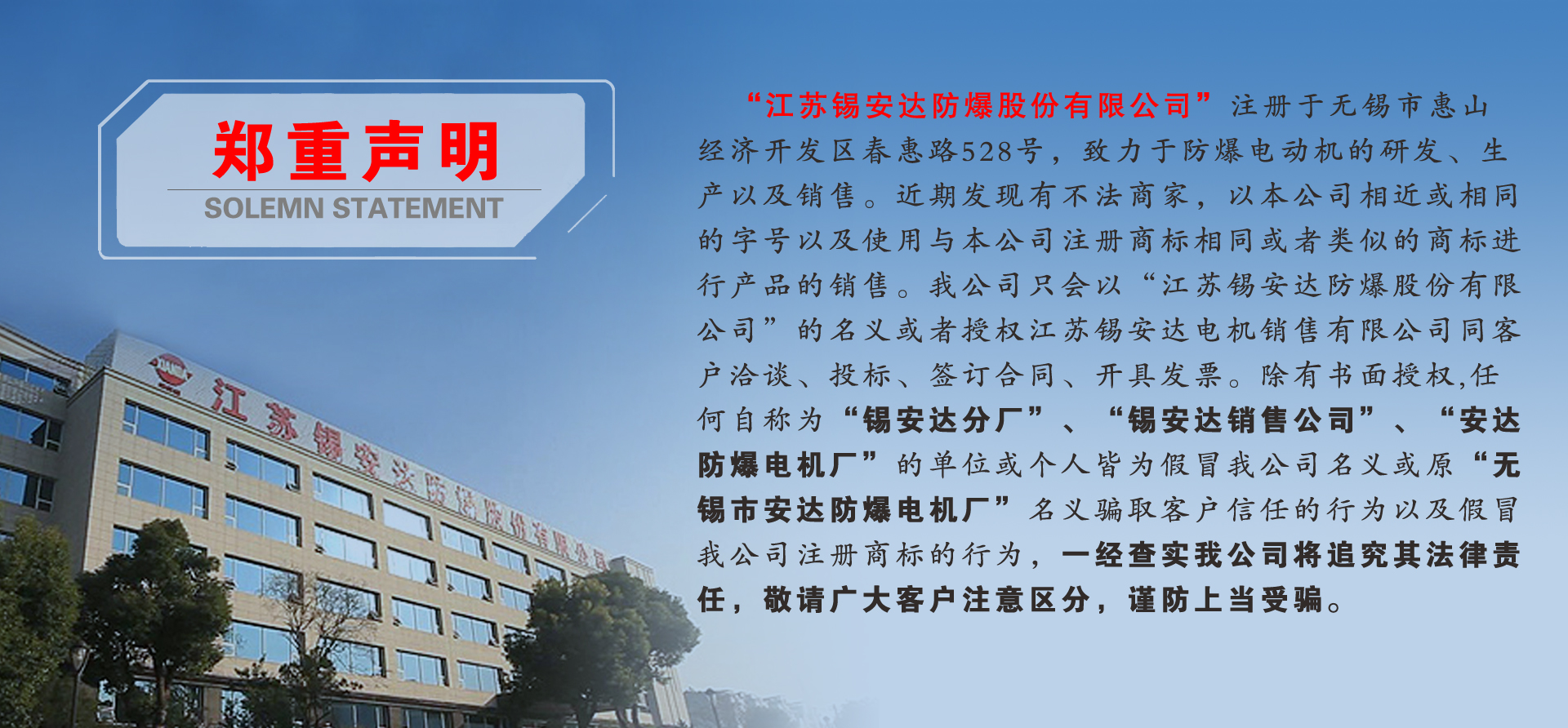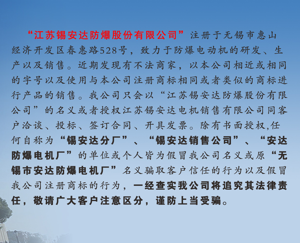 江蘇錫安達(dá)防爆股份有限公司由無(wú)錫市安達(dá)防爆電機(jī)廠和江蘇安達(dá)防爆機(jī)電集團(tuán)有限公司組建而成,從1986年起開始生產(chǎn)防爆電機(jī),是首批獲得全國(guó)工業(yè)產(chǎn)品生產(chǎn)許可證的防爆電機(jī)企業(yè)。